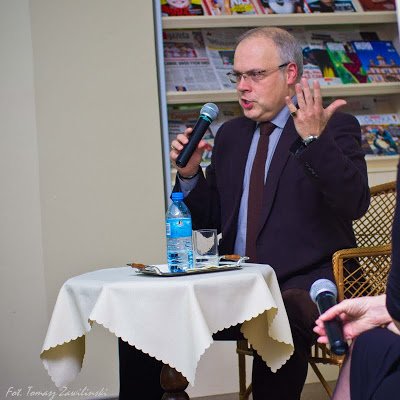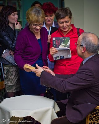 Już na wstępie pomiędzy gościem a uczestnikami spotkania nawiązał się bardzo sympatyczny kontakt. Marek Krajewski z właściwą sobie swadą, kulturą osobistą i kulturą słowa opowiadał o drodze do zawodowego pisarstwa, przedstawił swój dorobek twórczy. W czasie popołudnia w Bibliotece czytelnicy dowiedzieli się, w jaki sposób bohater spotkania zdobywał wiedzę na temat międzywojennego Lwowa i Breslau, zdradził też tajniki warsztatu pisarskiego. Odpowiadając na pytania czytelników, autor zdradził również tajemnicę pisania w duecie z Mariuszem Czubajem.