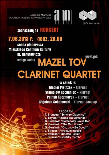 Ciepłe brzmienia klarnetów, piękne utwory, znakomite wykonanie! 7 czerwca o godzinie 20.00 na scenie plenerowej Miejskiego Centrum Kultury w Bełchatowie odbędzie sie niezwykle ciekawe, muzyczne wydarzenie: koncert MAZEL TOV CLARINET QUARTET! Wstęp wolny.