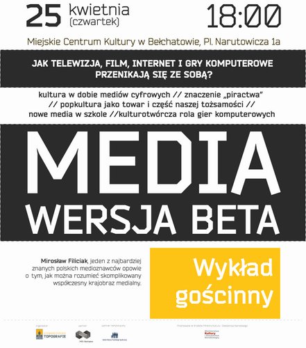 Wstępem do realizacji projektu będzie wykład gościnny Mirosława Filiciaka, medioznawcy ze Szkoły Wyższej Psychologii Społecznej pt. „Media, wersja beta. Film i telewizja w czasach gier komputerowych i internetu”. Wykład odbędzie się 25 kwietnia, o godz. 18:00, w sali koncertowej MCK.