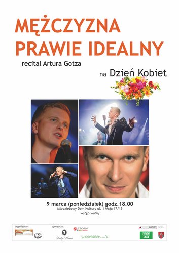 Biblioteka Publiczna im. Jana Machulskiego oraz Młodzieżowy Dom Kultury z okazji Dnia Kobiet zapraszają 9 marca o godz. 18.00 na recital Artura Gota Mężczyzna prawie idealny. Na akordeonie i instrumentach klawiszowych zagra Dariusz Igielski, na gitarze basowej Przemek Kowalski, a na perkusji Artur Mostowy. Wstęp wolny!