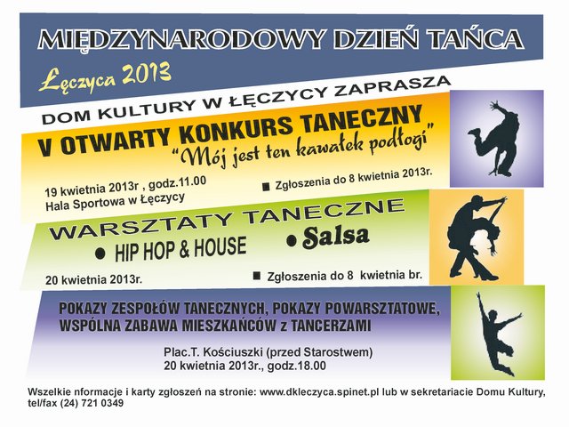 Dom Kultury w Łęczycy zaprasza na obchody Międzynarodowego Dnia Tańca w Łęczycy. Będą się na nie składać: V Otwarty Konkurs Taneczny "Mój jest ten kawałek podłogi" - 19 kwietnia, warsztaty taneczne salsy, hip-hopu i house'a oraz pokazy zespołów tanecznych na placu T. Kościuszki - 20 kwietnia.