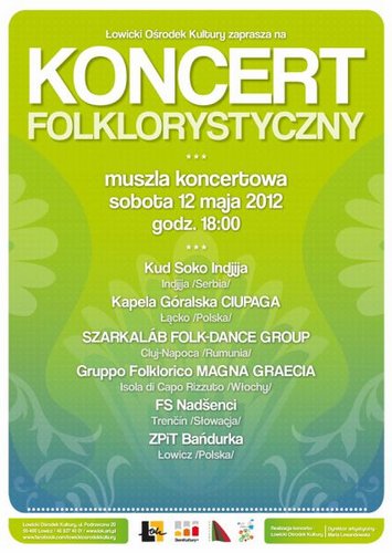 Łowicki Ośrodek Kultury, zaprasza serdecznie wszystkich miłośników folkloru, w sobotę 12 maja do muszli koncertowej. O godzinie 18.00 rozpocznie się koncert zespołów z Serbii, Polski, Rumunii, Włoch i Słowacji. Na koncert obowiązuje wstęp wolny. Został zrealizowany we współpracy z Międzynarodowym Festiwalem Folklorystycznym "Opoczno 2012", którego dyrektorem artystycznym jest Marta Lewandowska.