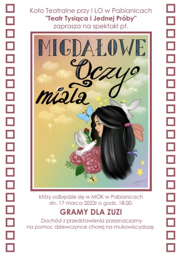 Koło Teatralne przy I LO w Pabianicach "Teatr Tysiąca i Jednej Próby" zaprasza na muzyczny spektakl pt. "Migdałowe oczy miała", który odbędzie się 17 marca w sali widowiskowej Miejskiego Ośrodka Kultury w Pabianicach. Wstęp wolny, jednak podczas spektaklu będą zbierane pieniądze dla Zuzi chorej na mukowiscydozę.