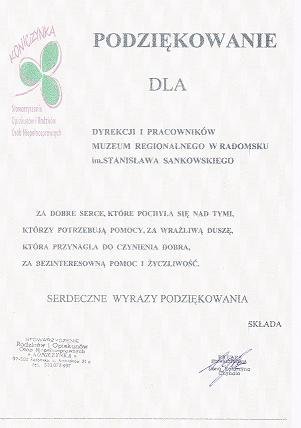Jednym z organizatorów było Muzeum Regionalne im. Stanisława Sankowskiego w Radomsku. Otrzymaliśmy podziękowanie za dobre serce, wrażliwą duszę oraz za bezinteresowną pomoc i życzliwość.