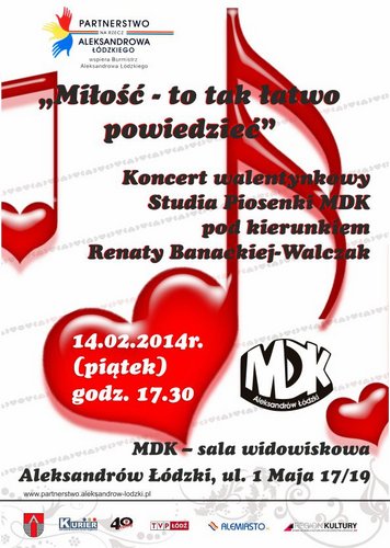 Partnerstwo na Rzecz Aleksandrowa Łódzkiego oraz Młodzieżowy Dom Kultury zapraszają na koncert walentynkowy "Miłość to tak łatwo powiedzieć". W piątek 14 lutego o godz. 17.30 w sali widowiskowej Domu Kultury w Aleksandrowie Łódzkim usłyszymy największe przeboje Kabaretu Starszych Panów, Kaliny Jędrusik, a także musicalowe w wykonaniu Studia Piosenki MDK pod kierunkiem Renaty Banackiej-Walczak. Wstęp wolny!