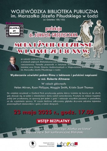 Biblioteczny Klub Filmowy „Klatka po klatce” zaprasza na spotkanie z dr Łukaszem Grzejszczakiem, który wygłosi prelekcję pt. "Moda i życie codzienne w latach 20 i 30 XX wieku”. Spotkanie odbędzie się 23 maja 2025 r. o godz. 17.00 w sali konferencyjnej Wojewódzkiej Biblioteki Publicznej im. Marszałka Józefa Piłsudskiego w Łodzi.