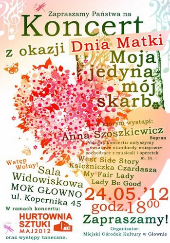 Zapraszamy Panstwa na koncert z okazji Dnia Matki 2012 zatytułowanego "Moja jedyna mój skarb", który odbędzie się w Sali Widowiskowej MOK Głowno 24 maja o godzinie 18.00
