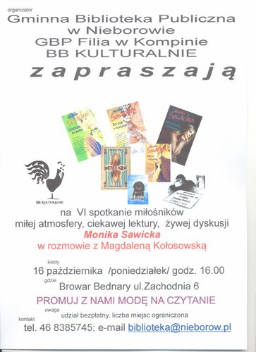 W ramach spotkań „Promuj z nami modę na czytanie” organizowanych przez GBP w Nieborowie Filia w Kompinie oraz Browar Bednary KULTURALNIE 16 października o godz. 16.00 odbędzie się spotkanie z Moniką Sawicką, autorką książek dla pań i nie tylko. Rozmowę poprowadzi Magdalena Kłosowska. Wstęp wolny!