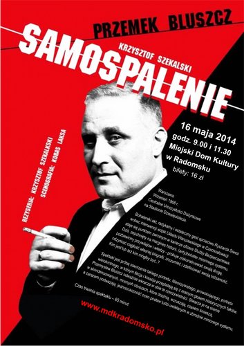 Monodram Samospalenie w wykonaniu Przemysława Bluszcza, będzie można obejrzeć 16 maja o godz. 9.00 i 11.30 w Miejskim Domu Kultury w Radomsku. Spektakl skierowany jest w do młodzieży szkół ponadgimnazjalnych i widzów dorosłych.