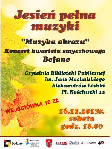 Biblioteka im. Jana Machulskiego w Aleksandrowie Łódzkim zaprasza na koncert kwartetu smyczkowego Befane "Muzyka obrazu" z cyklu Jesień pełna muzyki. 16 listopada o godz. 18.00 Kwartet przygotuje ucztę dla wielbicieli filmu, musicalu i operetki.