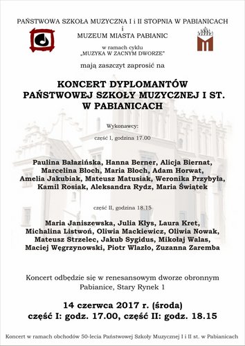 14 czerwca o godz. 17.00 w Muzeum Miasta Pabianic ułyszymy dyplomantów Państwowej Szkoły Muzycznej I stopnia w Pabianicach.