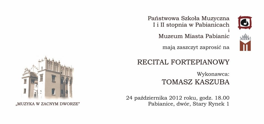 Zapraszamy do Pabianic na recital fortepianowy „Muzyka w zacnym dworze” w wykonaniu Tomasza Kaszuby. Koncert odbędzie się 24 października o godz. 18.00 na pabianickim dworze (Stary Rynek 1). Na koncert zapraszają: Państwowa Szkoła Muzyczna I i II stopnia i Muzeum Miasta Pabianic.
