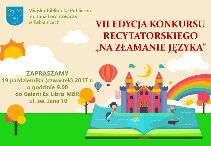 Miejska Biblioteka Publiczna im. Jana Lorentowicza w Pabianicach zaprasza uczniów klas trzecich pabianickich szkół podstawowych do udziału w konkursie recytatorskim „Na złamanie języka”, który odbędzie się 19 października o godz. 9.00 w Galerii Ex Libris przy ul. św. Jana 10 w Pabianicach. Zadaniem uczestników konkursu jest zaprezentowanie utworu poetyckiego zawierającego trudności logopedyczne.