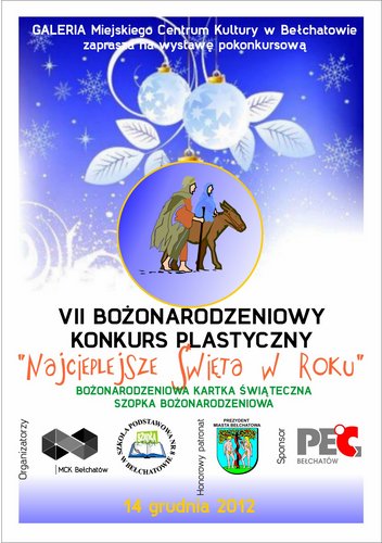 Zapraszamy na wystawę podsumowującą konkurs plastyczny pt. „Najcieplejsze święta w roku”, na której będzie można podziwiać bożonarodzeniowe kartki i szopki wykonane przez dzieci ze szkół podstawowych.Wystawę można oglądać w Galerii Miejskiego Centrum Kultury od 14 do 31 grudnia 2012 r.
