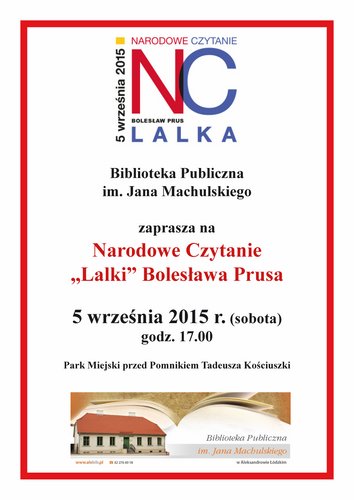 Biblioteka Publiczna im. Jana Machulskiego w Aleksandrowie Łódzkim zaprasza wszystkich kochających książki do udziału w Narodowym Czytaniu "Lalki" Bolesława Prusa.