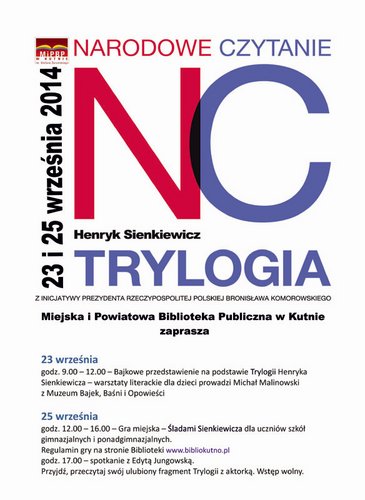 Już od trzech lat z inicjatywy prezydenta RP Bronisława Komorowskiego Polacy biorą udział w akcji Narodowe Czytanie, która stanowi doskonałą okazję, by przypomnieć sobie największe dzieła polskiej literatury. W tym roku w Miejskiej i Powiatowej Bibliotece Publicznej w Kutnie, wspólnie z aktorką Edytą Jungowską, uczestnicy będą mieli możliwość zaprezentowania swojego ulubionego fragmentu powieści Sienkiewicza. Dodatkowo, Biblioteka organizuje Grę Miejską - Śladami Sienkiewicza dla uczniów szkół gimnazjalnych i ponadgimnazjalnych (23 i 25 września).