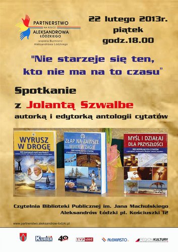 Biblioteka Publiczna im.Jana Machulskiego w Aleksandrowie Łódzkim zaprasza 22 lutego ( piątek) o godz.18.00 na spotkanie z niezwykłą osobą - Jolantą Szwalbe, autorką i edytorką antologii cytatów, osobą która swoim przykładem daje świadectwo prawd przez siebie głoszonych, która pokazuje jak czerpać radość z życia, brać przykład z tych, którym się udało osiągnąć sukces, jak być twórczym, kreatywnym i żyć w zgodzie ze sobą. Pani Jolanta będzie cytowała oraz komentowała inspirujące myśli jakie przez lata kolekcjonowała oraz opowie niezwykłe histrorie i anegdotki o ich autorach. Po spotkaniu będzie możliwość nabycia książek, antologii cytatów wydawnictwa pani Szwalbe. Jolanta Szwalbe edukatorka, edytorka i autorka trzech antologii cytatów: Myśl i działaj dla przyszłości-900 inspirujących myśli o:pieniądzach, inwestowaniu, decyzjach,sukcesie, przyszłości...; Złap na zawsze wiatr w żagle- 1000 inspirujących myśli, które mają rozbudzić w tobie ducha przedsiębiorczości i Wyrusz w drogę- 900 inspirujących myśli Jana Pawła II o:działaniu, człowieku, życiu,starości, pracy, bogactwie, cywilizacji miłości..... Przedmowę do dwóch pierwszych napisała dr Ewa Lisowska ze SGH, do "Wyrusz w drogę" red. Ewa Karabin z Więzi. Patronem medialnym "Wyrusz w drogę" jest miesięcznik Znak. Jak mówi jej misją jest: edukować i inspirować do działania. Jej zbiory kieruje do wszystkich bez względu na wiek. Książki promuje podczas spotkań autorskich w formie inspirujących wykładów min. na Uniwersytetach Trzeciego Wieku, w bibliotekach, klubach, podczas różnych konferencji. Z pochodzenia jest Łodzianką.