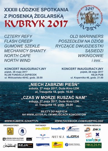 26 maja rozpoczynają się XXXIII Łódzkie Spotkania z Piosenką Żeglarską KUBRYK 2017! Koncerty inauguracyjne odbędą się w piątek w dwóch łódzkich pubach: Zapiecek oraz Keja Pub. A w sobotę koncerty główne w Łódzkim Domu Kultury. Na tegorocznym Kubryku zagrają m.in. Cztery Refy, Flash Creep, Gumowe Szekle, Mechanicy Shanty, North Cape, North Wind, Old Marinners, Poszedłem na Dziób, Ryczące Dwudziestki, Sąsiedzi i Wikingowie.