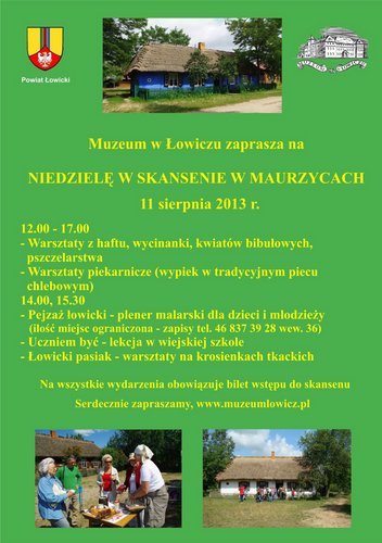 Muzeum w Łowiczu zaprasza na NIEDZIELĘ W SKANSENIE W MAURZYCACH w dniu 11 sierpnia 2013 r. W godzinach od 12.00 do 17.00 odbędą się warsztaty z zakresu haftu, wycinanki, kwiatów bibułowych, pszczelarstwa oraz warsztaty piekarnicze (wypiek w tradycyjnym piecu chlebowym). Dla dzieci i młodzieży zaplanowano plener malarski, podczas którego nauczą się podstaw pejzażu (w związku z ograniczoną liczbą miejsc, na plener obowiązują zapisy, tel. 46 837 39 28 wew. 36).