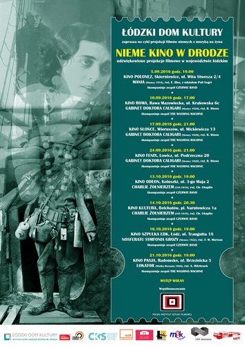 Łódzki Dom Kultury zaprasza na cykl projekcji filmów niemych z muzyką na żywo pn. „Nieme kino w drodze – udźwiękowione projekcje filmowe w województwie łódzkim”. Projekt realizowany będzie w partnerstwie z 8 powiatowymi ośrodkami kultury z woj. łódzkiego. Do projektu przystąpiło 8 kin należących do Regionalnej Sieci Kin Cyfrowych Województwa Łódzkiego.