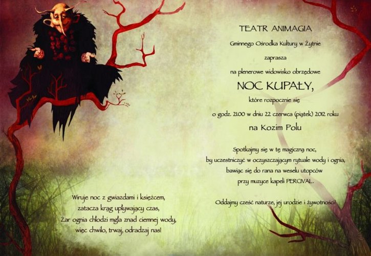 Teatr Animagia Gminnego Ośrodka Kultury w Żytnie zaprasza na plenerowe widowisko obrzędowe "Noc Kupały", które rozpocznie się o godz. 21.00 w dniu 22 czerwca 2012 r. (piątek) na Kozim Polu.