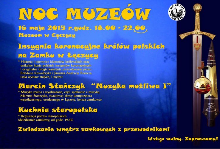 Muzeum w Łęczycy 16 maja w godz. 18.00 - 22.00 zaprasza na NOC MUZEÓW. W programie: prezentacja klejnotów królewskich oraz unikalnych kopii polskich insygniów koronacyjnych i oryginalnych drogich kamieni, zwiedzanie Zamku Królewskiego w Łęczycy, a także spotkania z muzyką Marcina Stańczyka - światowej sławy kompozytora urodzonego w Łęczycy. WSTĘP WOLNY!
