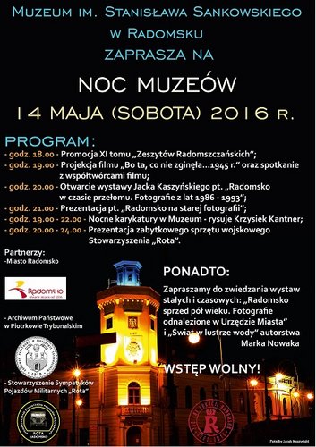 Muzeum Regionalne im. Stanisława Sankowskiego w Radomsku w najbliższą sobotę zaprasza na Noc Muzeów. W programie m.in.: promocja XI tomu „Zeszytów Radomszczańskich”, projekcja filmu „Bo ta, co nie zginęła … 1945 r.” oraz spotkanie z współtwórcami filmu i otwarcie wystawy Jacka Kaszyńskiego pt. „Radomsko w czasie przełomu. Fotografie z lat 1986-1993”. A nocne karykatury w Muzeum rysował będzie Krzysiek Kantner.