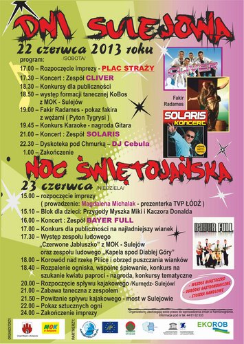 Urząd Miejski i Miejski Ośrodek Kultury w Sulejowie zapraszają w dniach 22-23 czerwca na Dni Sulejowa i Noc Świętojańską, które odbędą się na placu straży w Sulejowie.
