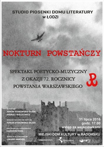 31 lipca o godz. 17.00 w Miejskim Domu Kultury w Radomsku odbędzie się widowisko muzyczne „NOKTURN POWSTAŃCZY” aktorów scen łódzkich i Studia Forum Piosenki Teresy Stokowskiej-Gajdy. Imprezie towarzyszyć będą animacje patriotyczne.