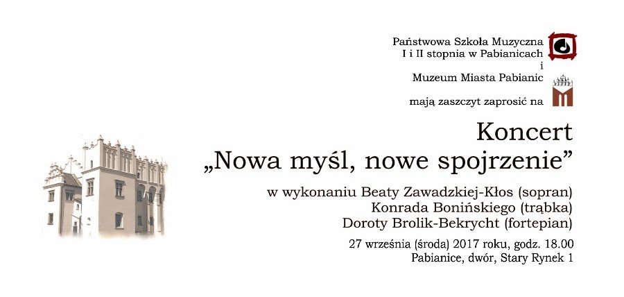 27 września o godz. 18.00 w Muzeum Miasta Pabianic odbędzie się koncert "Nowa myśl, nowe spojrzenie". Śpiew przy akompaniamencie fortepianu i trąbki w niezwykle oryginalnym doborze utworów zaprezentują wykładowcy Akademii Muzycznej im. Grażyny i Kiejstuta Bacewiczów w Łodzi. A 4 października z okazji Międzynarodowego Dnia Muzyki wystąpią uczniowie i nauczyciele Państwowej Szkoły Muzycznej I i II st. w Pabianicach. Wstęp wolny!