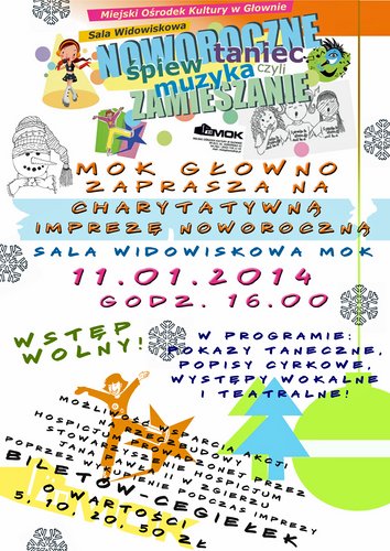Miejski Ośrodek Kultury w Głownie zaprasza 11 stycznia o godz. 16.00 na "Noworoczne Zamieszanie 2014", które wzorem lat ubiegłych jest barwnym przeglądem dorobku artystycznego oraz prezentacją grup tanecznych, wokalnych, cyrkowych i teatralnych działających przy MOK Głowno. Tegoroczny koncert o charakterze świąteczno-noworocznym wzbogaci akcja charytatywna na rzecz budowy hospicjum.