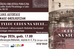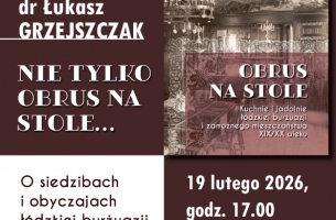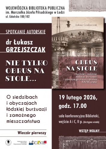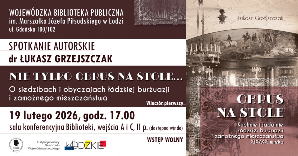 W dniu 19 lutego 2026 roku o godzinie 17:00 w sali konferencyjnej Wojewódzkiej Biblioteki publicznej im. Marszałka Józefa Piłsudskiego w Łodzi (przy ul. Gdańskiej 100/102) odbędzie się spotkanie autorskie wokół książki „Obrus na stole. Kuchnie i jadalnie łódzkiej burżuazji i zamożnego mieszczaństwa XIX-XX wieku” autorstwa dr. Łukasza Grzejszczaka.
