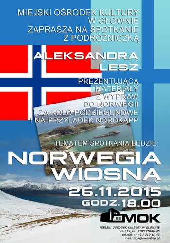 Miejski Ośrodek Kultury w Głownie zaprasza w czwartek, 26 listopada, o godz. 18.00 na spotkanie z podróżniczką Aleksandrą Lesz, która opowie o swej wyprawie do Norwegii, na koło podbiegunowe oraz przylądek Nordkapp. Wstęp bezpłatny.