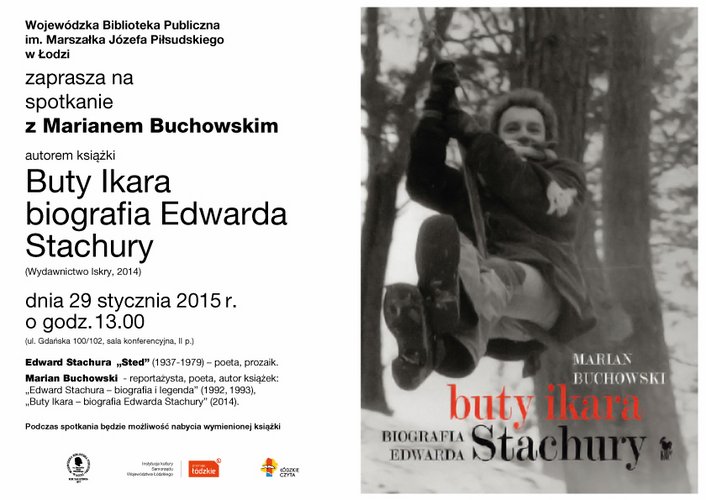 Wojewódzka Biblioteka Publiczna im. Marszałka Józefa Piłsudskiego w Łodzi zaprasza na spotkanie z Marianem Buchowskim autorem książki „Buty Ikara. Biografia Edwarda Stachury”. Spotkanie odbędzie się w czwartek 29 stycznia 2015 r. o godz. 13.00 w sali konferencyjnej WBP w Łodzi (ul. Gdańska 100/102, wejście A, II piętro).