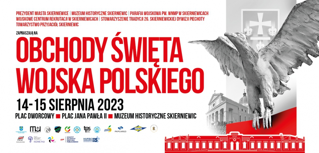 Prezydent Miasta Skierniewice, Muzeum Historyczne Skierniewic, Parafia Wojskowa pw. WNMP w Skierniewicach, Wojskowe Centrum Rekrutacji w Skierniewicach, Stowarzyszenie Tradycji 26. Skierniewickiej Dywizji Piechoty, Towarzystwo Przyjaciół Skierniewic zapraszają na Obchody Święta Wojska Polskiego w Skierniewicach.
