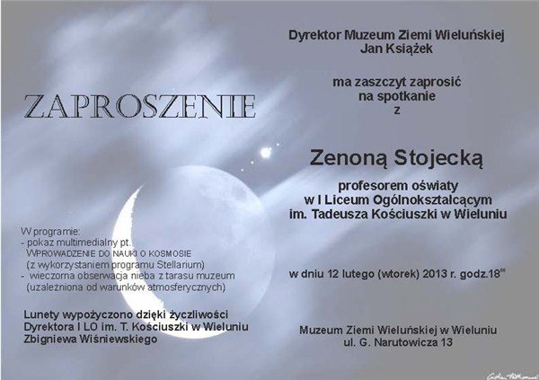 W dniu 12 lutego o godzinie 18.00 w Muzeum Ziemi Wieluńskiej w Wieluniu odbędzie się spotkanie z Zenoną Stojecką profesorem oświaty w I Liceum Ogólnokształcącym im. Tadeusza Kościuszki w Wieluniu (w województwie łódzkim jest tylko dwóch profesorów oświaty). W programie: pokaz multimedialny połączony z prelekcją pt. Wprowadzenie do nauki o kosmosie (z wykorzystaniem programu Stellarium) oraz wieczorna obserwacja nieba z tarasu muzeum (uzależniona od warunków atmosferycznych) przez lunety wypożyczone z obserwatorium astronomicznego w I LO im. T. Kościuszki w Wieluniu.