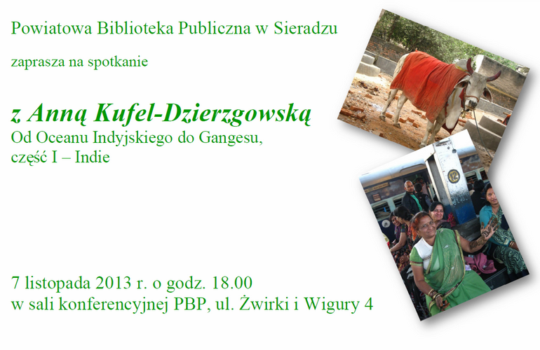 Zapraszamy na spotkanie z Anną Kufel-Dzierzgowską Od Oceanu Indyjskiego do Gangesu. Najbliższa, pierwsza część z cyklu spotkań, poświęcone będzie Indiom i odbędzie się 7 listopada 2013 r. o godz. 18.00 w sali konferencyjnej Powiatowej Biblioteki Publicznej w Sieradzu.