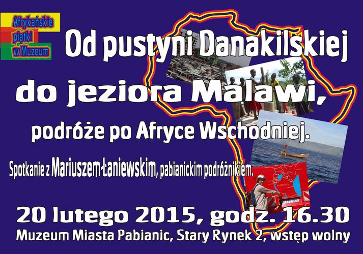 Muzeum Miasta Pabianic zaprasza na cykl spotkań Afrykańskie piątki w Muzeum, które odbywać się będą w kolejne piątki lutego i marca. Cykl zainauguruje prelekcja pabianickiego podróżnika Mariusza Łaniewskiego, opowiadającego o swoich wyjazdach do krajów Afryki Wschodniej. Pierwsze spotkanie już 20 lutego o godz. 16.30. Wstęp wolny!
