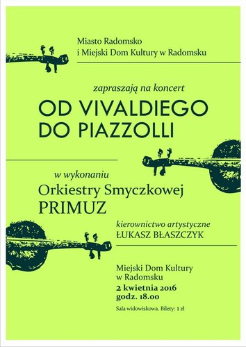 „Od Vivaldiego do Piazzolli” to tytuł koncertu muzyki klasycznej, który odbędzie się 2 kwietnia 2016 r. w MDK Radomsko. Na muzycznej scenie MDK o godz.18.00 wystąpi Orkiestra Smyczkowa PRIMUZ. Koncert odbędzie się w 11. Rocznicę śmierci Ojca Świętego Jana Pawła II.