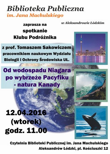 Biblioteka Publiczna im. Jana Machulskiego w Aleksandrowie Łódzkim zaprasza na spotkanie Klubu Podróżnika. 12 kwietnia o godz. 11.00 gościem czytelni biblioteki będzie profesor Tomek Sakowicz, pracownik naukowy Uniwersytetu Łódzkiego, który opowie o wyprawie do Kanady. Wstęp wolny!