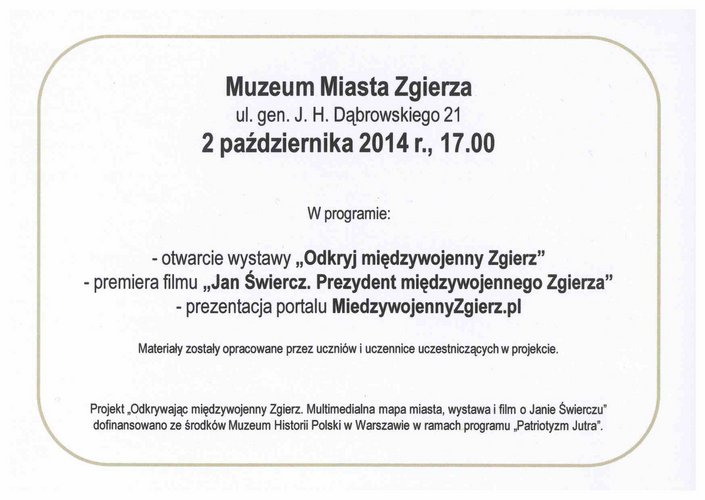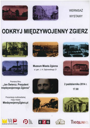 2 października o godz. 17:00 w Muzeum Miasta Zgierza odbędzie się wernisaż wystawy podsumowującej projekt "Odkrywając międzywojenny Zgierz" realizowany z programu Patriotyzm Jutra. W programie otwarcia: premiera filmu "Jan Świercz. Prezydent międzywojennego Zgierza" i prezentacja portalu MiedzywojennyZgierz.pl.