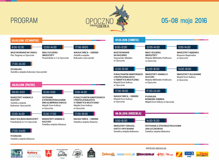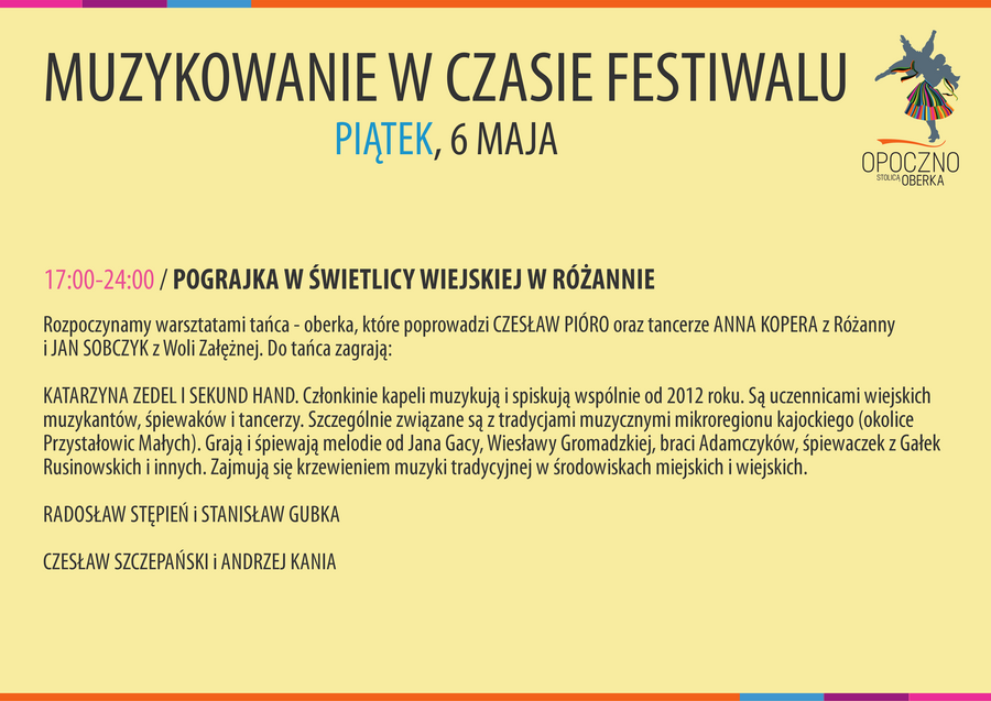Od czwartku do niedzieli w przestrzeni miejskiej i wiejskiej Gminy Opoczno będą odbywały się warsztaty tańca, zajęcia „Małego Kolberga”, nauka gry na bębenku, spotkania z etnomuzykologami, pokazy filmów, wystawy zdjęć. Czwartek, piątek i sobota będą kończyły się otwartymi pograjkami (odpowiednio: Bukowiec Opoczyński, Różanna, Opoczno). Prócz zespołów silnie inspirujących się muzyką ludową regionu opoczyńskiego, wystąpią rodzime kapele, a także Mistrzowie. Jednakże to swoiste artystyczne spotkanie młodych pokoleń, z osobami dzięki którym przetrwały tradycyjne brzmienia, będzie przede wszystkim spontaniczną zabawą mieszkańców, gości, entuzjastów tradycji ludowej, kapel oraz Mistrzów opoczyńskich oberków.