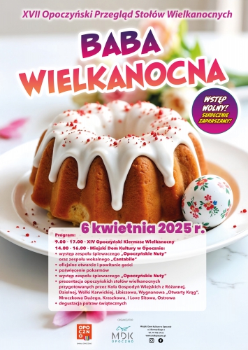 Miejski Dom Kultury im. T. Sygietyńskiego w Opocznie serdecznie zaprasza na XVII Opoczyński Przegląd Stołów Wielkanocnych „Baba Wielkanocna”. To sztandarowe wydarzenie, będące okazją do promocji lokalnych zwyczajów, tradycji i smaków, które na stałe wpisało się w kalendarz Gminy Opoczno i MDK odbędzie się już 6 kwietnia!
