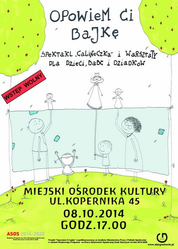 Wśród 20 różnych miejscowości z całej Polski, które dołączyły się do akcji "Opowiem Ci bajkę" znalazło się również miasto Głowno i Miejski Ośrodek Kultury, w którym 8 października o godz. 17.00 odbędzie się spektakl teatralny “Calineczka” grany z wykorzystaniem lalek. Po bajce odbędą się warsztaty rozwijające wyobraźnię, prowokujące do twórczego myślenia, wykorzystujące innowacyjne metody twórczej aktywności i wzmacniające więzi między wnukami a dziadkami. Wstęp wolny!