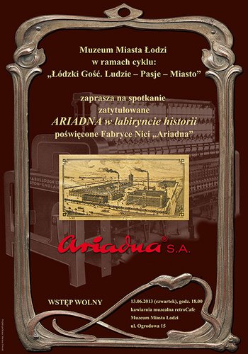 Barwną opowieść o dziejach fabryki, przygotowaną przez pana Marka Gajdamowicza, jednego z najstarszych pracowników firmy „Ariadna” SA. poprzedzi krótka prezentacja historyczna Marcina Szymańskiego, historyka z Uniwersytetu Łódzkiego, a także pracownika Muzeum Miasta Łodzi. Spotkanie wzbogaci kameralna ekspozycja pamiątek i przedmiotów związanych z fabryką. Ponadto uczestnicy spotkania zostaną zaproszeni na zwiedzanie „Ariadny” w ustalonym wspólnie terminie. Spotkaniu będzie także towarzyszyć sprzedaż wydawnictw muzealnych.