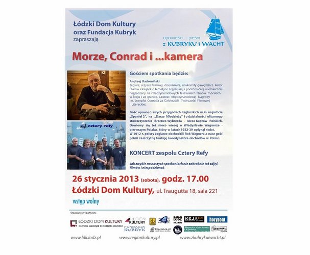 W dniu 26 stycznia 2013 o godz. 17.00 w sali 221 Łódzkiego Domu Kultury odbędzie się kolejne spotkanie z cyklu Opowieści i pieśni z kubryku i wacht. Gościem spotkania będzie Andrzej Radomiński – żeglarz, reżyser filmowy, dziennikarz, autor książek o tematyce żeglarskiej i podróżniczej. Wystąpi również łódzka grupa Cztery Refy. Zapraszamy miłośników żeglarstwa i nie tylko!