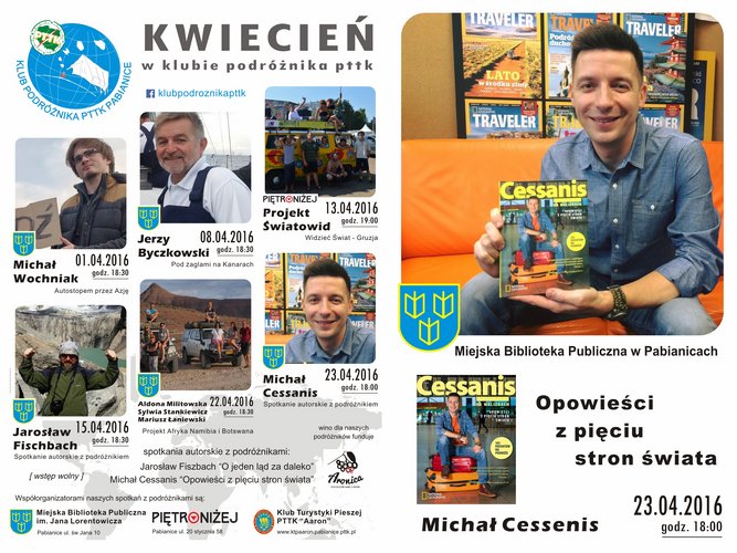 23 kwietnia swoją pasją i pozytywną energią podzieli się z uczestnikami spotkania Michał Cessanis - podróżujący dziennikarz i sekretarz redakcji „National Geographic Traveler”. Spotkanie odbędzie się o godz. 18.00 w Galerii Ex Libris Miejskiej Biblioteki Publicznej im. Jana Lorentowicza w Pabianicach. Wstęp wolny!