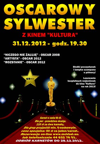 Miejskie Centrum Kultury w Bełchatowie przygotowało specjalną propozycję na zakończenie roku - „Oscarowego Sylwestra z kinem „Kultura”. Zabawę rozpoczniemy o godz. 19.30. Na ten wieczór proponujemy trzy znakomite, nagrodzone Oscarami filmy: "Niczego nie żałuję", "Artysta" oraz "Rozstanie".