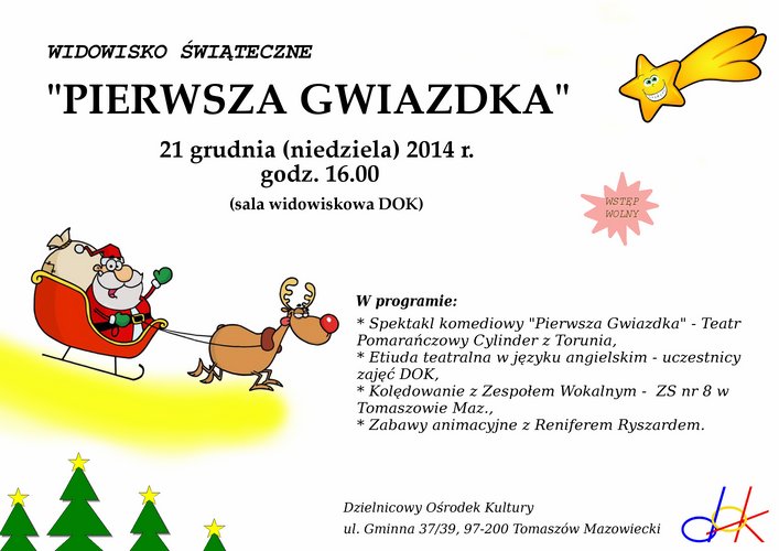 Dzielnicowy Ośrodek Kultury w Tomaszowie Mazowieckim zaprasza dzieci wraz z rodzicami na wyjątkowe świąteczne widowisko "PIERWSZA GWIAZDKA", które odbędzie się w niedzielę 21 grudnia o godz. 16.00 w sali widowiskowej. W programie: spektakl Pierwsza gwiazdka w wykonaniu Teatru Pomarańczowy Cylinder z Torunia, etiuda teatralna w języku angielskim, kolędowanie z zespołem wokalnym i zabawy animacyjne z Reniferem Ryszardem.