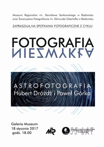 Muzeum Regionalne im. Stanisława Sankowskiego w Radomsku oraz Towarzystwo Fotograficzne im. Edmunda Osterloffa w Radomsku zapraszają na spotkania fotograficzne z cyklu „Fotografia niezwykła”. Pierwsze spotkanie ph. „Astrofotografia” z udziałem Huberta Dróżdża oraz Pawła Górki odbędzie się 18 stycznia 2017 r. (środa) o godz. 18.00 w Galerii Muzeum.
